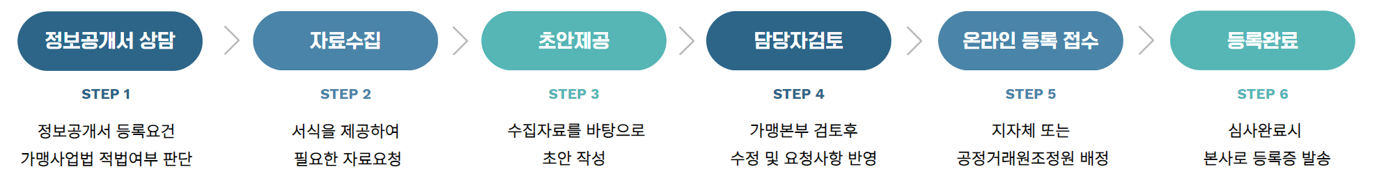 2008년도 02월 04일 부터 시행되었으며 프랜차이즈 가맹본부는 정보공개서를 가맹사업법의 형식에 맞게 작성하여 공정거래조정원 또는 지자체에 등록해야 하며 정보공개서에 기재하여야 할 항목은 다음과 같습니다.